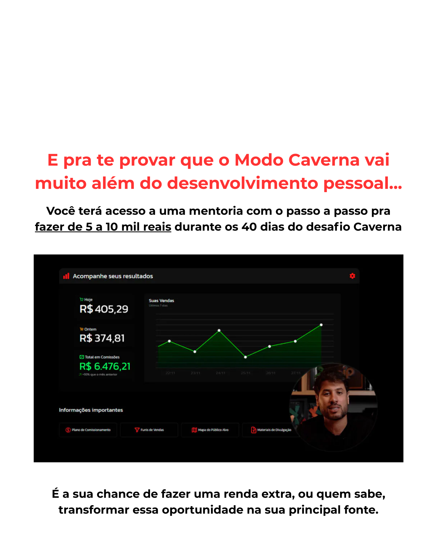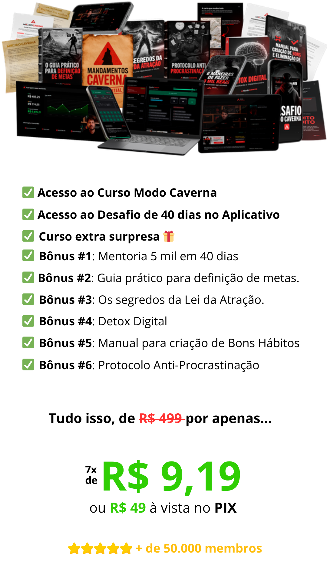 O Modo Caverna nasceu dessa jornada — não é só um app, é um sistema de transformação pessoal que já impactou a vida de milhares de pessoas. Agora, pode impactar a sua também.